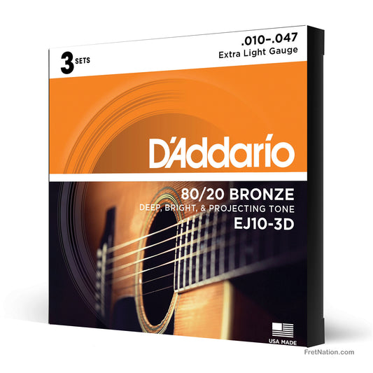 D'Addario 80/20 Bronze Acoustic Guitar 3-Pack - 6-String 10-47 Extra Light EJ10-3D
