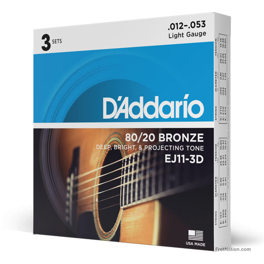 D'Addario 80/20 Bronze Acoustic Guitar 3-Pack - 6-String 12-53 Light EJ11-3D