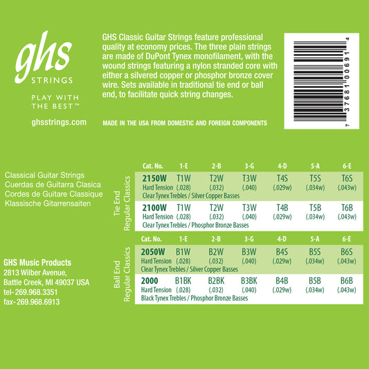 GHS Tie End Regular Classics Nylon Classical Guitar 06-String Set - 28-43 Hard Tension 2100W