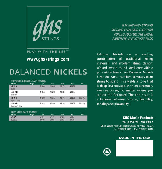 GHS Balanced Nickels Pure Nickel Round Wound Bass Strings Long Scale - 4-String 44-106 4M-NB