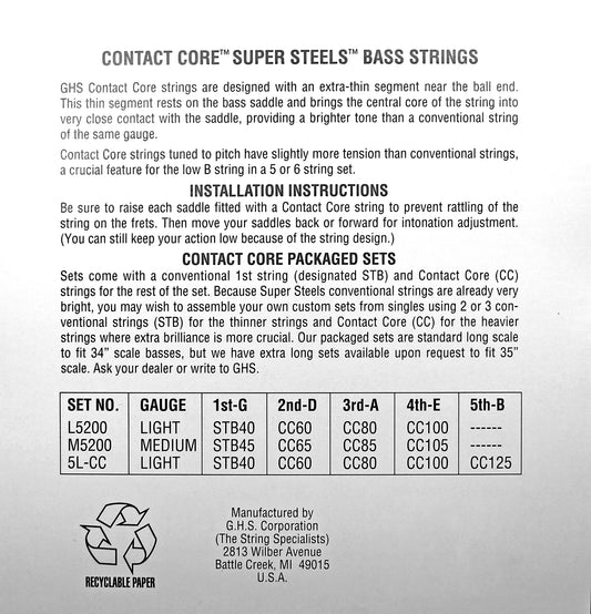 GHS Contact Core Super Steels Exposed Core Electric Bass Strings Long Scale - 5-String 40-125x 5L-CC