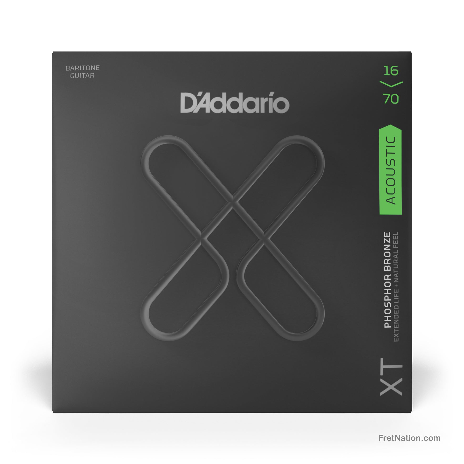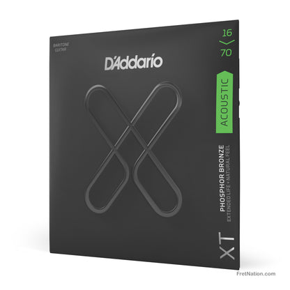 Since D'Addario introduced Phosphor Bronze acoustic guitar strings in 1974, they've been synonymous with warm, well-balanced tone. XT Phosphor Bronze offers that and more, boasting enhanced break resistance, better pitch stability, and longer life than D'Addario's standard phosphor bronze strings. The XT coating delivers advanced corrosion resistance, while still retaining the warm tone and natural feel of the uncoated string. Beneath the coating, these XT acoustic strings are constructed with a NY Steel core, phosphor bronze wrap wire, and Fusion Twist technology, affording tonal versatility with added resilience, excellent for a wide range of acoustic styles. This 16-70 gauge baritone set is optimized for baritone acoustic guitars.