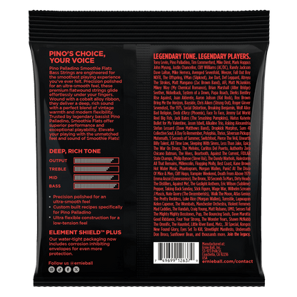 Introducing The Ernie Ball Pino Palladino Smoothie Flats Bass Strings, engineered for a smooth, effortless playing experience. With precision polishing for an ultra-smooth feel, these premium flatwound Ernie Ball Bass Strings strings glide easily under your fingers. Wound with a cobalt alloy ribbon, they deliver a deep, rich tone with a perfect blend of vintage warmth and modern flexibility. Trusted by legendary bassist Pino Palladino, Smoothie Flats offer superior performance and exceptional playability. Elevate your bass tone and enjoy the unmatched feel of Smoothie Flats!